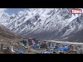 From the edge of the terminal moraine of the Langtang Lirung Glacier, there is a 360 degree view of icy peaks, and below is the monastery town of Kyanjin blanketed in overnight snow.