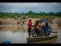 Every few minutes, traders with goods on motorcycles line up on one bank of Kendra River in Tikapur to cross over to the other side. There is a shed nearby made up of wood and a tarpaulin that shelters them as they wait to be ferried across.